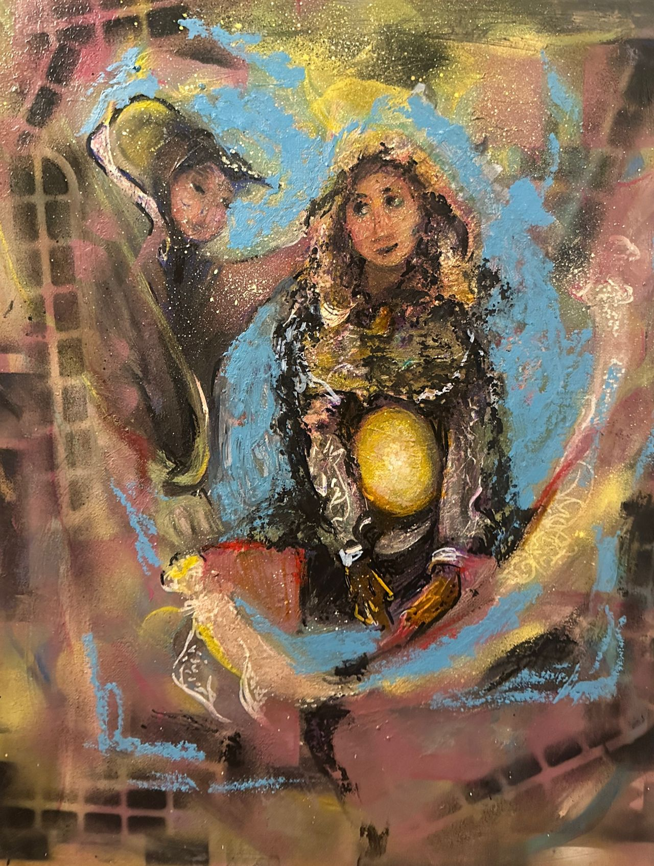 My symbolic work, “The Archive/2,” tries to give form to this intimate transfer. It depicts one woman who might be pregnant or might be cradling a radiant core of wisdom, while another’s hand rests on her shoulder in a gesture of support. They are surrounded by dynamic shapes representing the swirling “frontiers” of narratives that shape how we understand and use what we’ve been given.